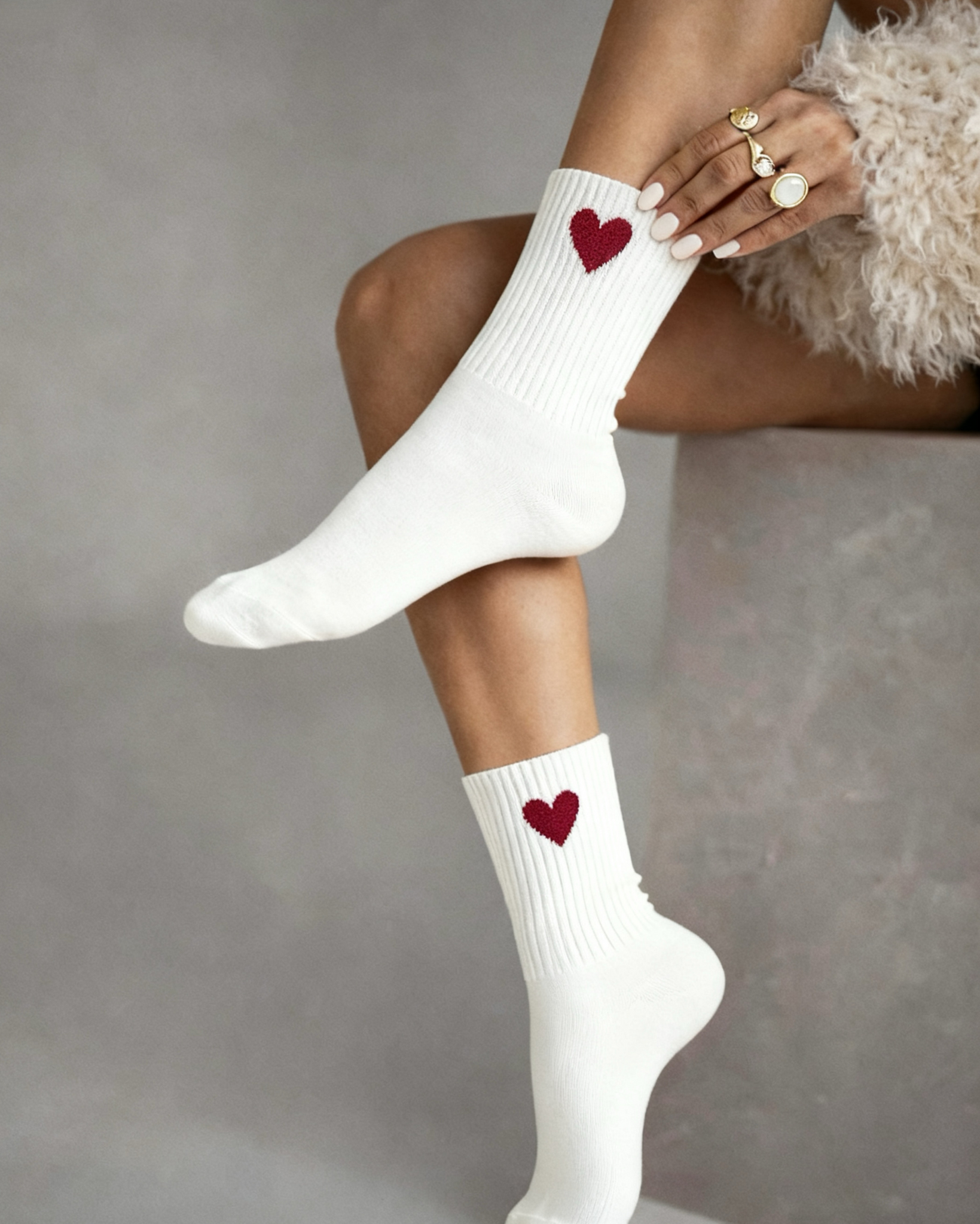 Das 2er Set kombiniert ein Paar in einem warmen Off-White-Ton mit Bordeaux-Herz und ein Paar in Chocolate Brown mit einem Herz in Poppy Red – ein Zusammenspiel aus sanfter Süße, Wärme und Farbe.